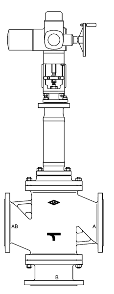 Design N/A Diverting | Dia. Nominal N/A 10 Inch | Actuator N/A AUMA SAR 10.1 | Body Material N/A Cast steel | Form N/A 3-way | Standard Cv-Value N/A 647 |